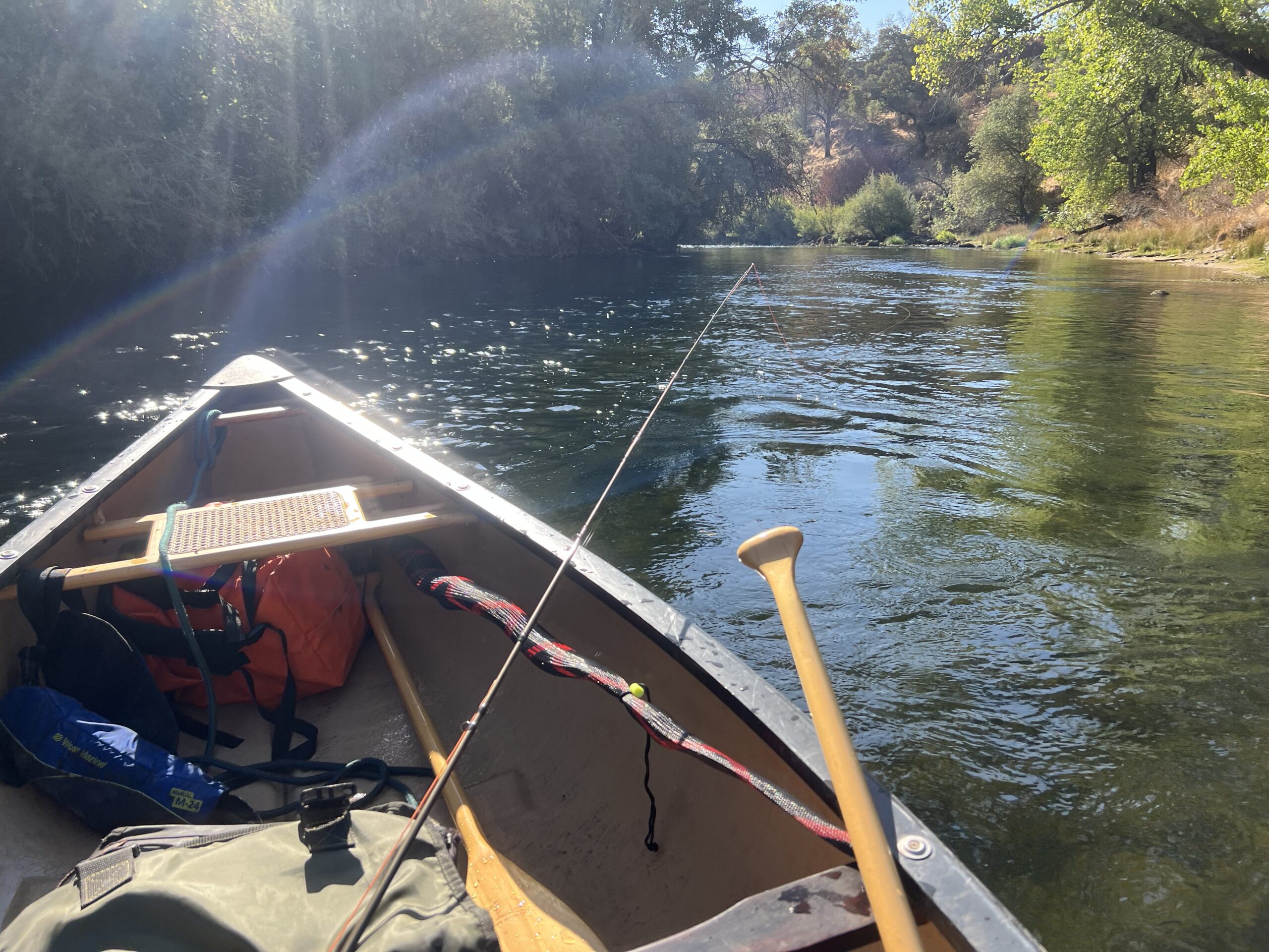 The drift itself was lovely, but til about midway between Knights Ferry and Horseshoe all I saw were carp. Lots of them. Big, averaging 16 to 20 inches. Some bigger. They were not interested in my offerings. I switched droppers frequently, to no avail. P/T nymphs, Stonefly nymphs, Zug bug, prince nymph. None appealed to our target audience.